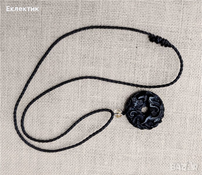 обсидиан и са с кръгла форма с диаметър 46,5 mm. Дебелината е около 11 mm, като двата не са напълно идентични (както може да се очаква при естествените камъни) Изображението е на китайски митичен дракон (Pixiu, Qilin, Ruyi Dragon, Grass dragon и др.)