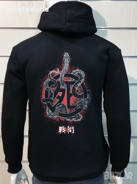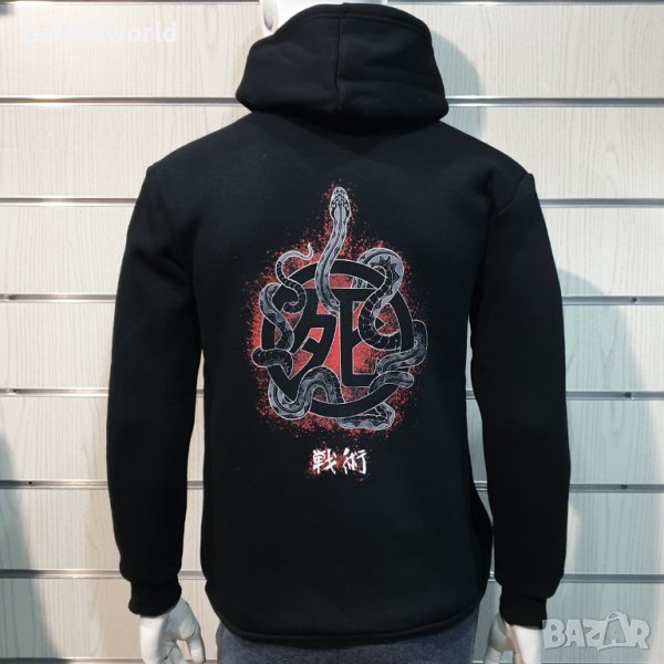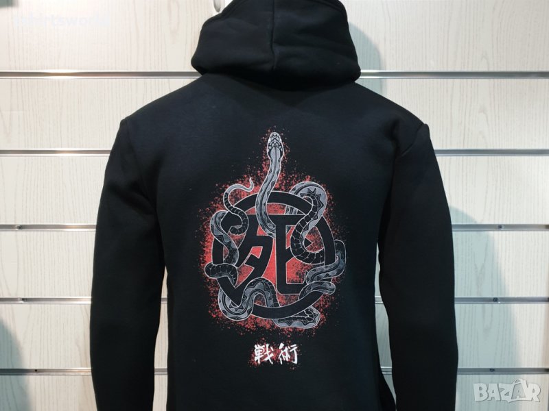 Нов мъжки суичър в черен цвят с качулка, две джобчета и дигитален печат на музикалната група IRON MAIDEN - Senjutsu Samurai Eddie Snake Death с дигитален печат и на гърба. Произведен в България от висококачествен 100% памук - триконечна пенирана вата с кардировка, което го прави изключително топъл и желан от нашите дългогодишни клиенти. Моделът е подходящ за пролетния и есенно-зимният сезон, има ластични маншети на китките и ханша, запазващи топлината. Разполага с мека подплата и два отворени джоба в страни. Свободната кройка го прави подходящ както за спорт, така и за ежедневно носене с дънкови панталони. Марката PRINTEX от години се слави със своите топли и качествени суичъри.