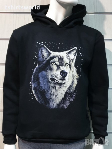 Страхотен нов мъжки суичър в черен цвят с качулка, две джобчета и дигитален печат Вълк - Звезди, Серия вълци. Произведен в България под марката PRINTEX от висококачествен 100% памук - триконечна пенирана вата с кардировка, което го прави изключително топъл и желан от нашите дългогодишни клиенти. Моделът е подходящ за пролетния и есенно-зимният сезон, има ластични маншети на китките и ханша, запазващи топлината. Разполага с мека подплата и два отворени джоба в страни. Свободната кройка го прави подходящ както за спорт, така и за ежедневно носене с дънкови панталони. Марката PRINTEX от години се слави със своите топли и качествени суичъри.