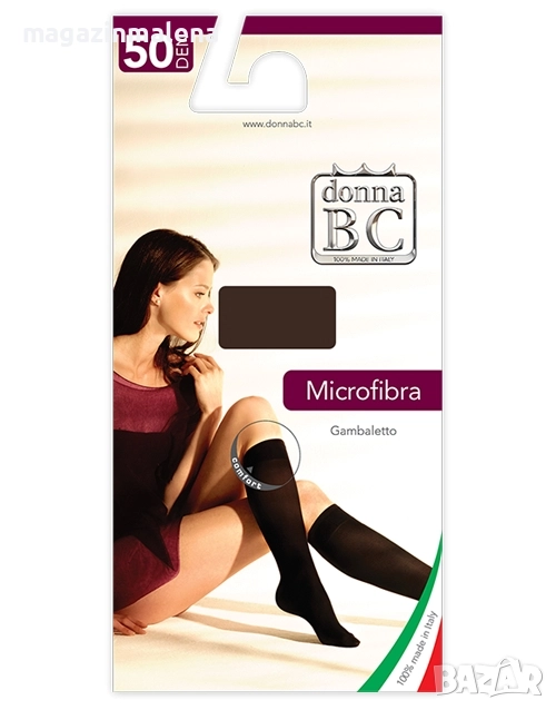 2 чифта Donna BC Micro gamb 50 плътни чорапи до коленатас дебелина 50DEN на италианската марка за микрофибърни чорапи Donna BC / Донна БС. Продуктът представлява кадифени плътничорапи до коляното, изработени от мек и еластичен микрофибър;мек широк ластик; невидими пръсти. На всеки един артикул е удостоверено, че артикулът еПроизведен в Италия (Made in Italy).Цената е за 2 чифта = 4 броя чорапи.