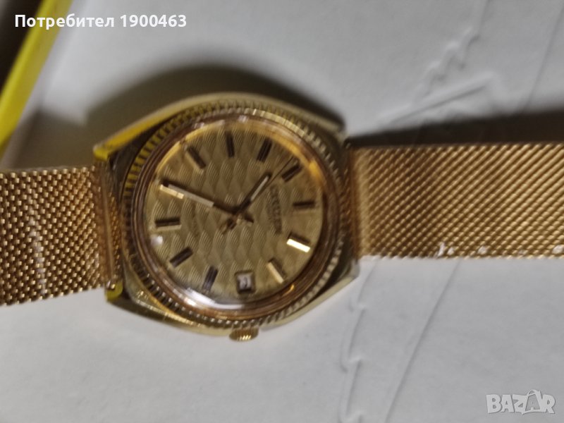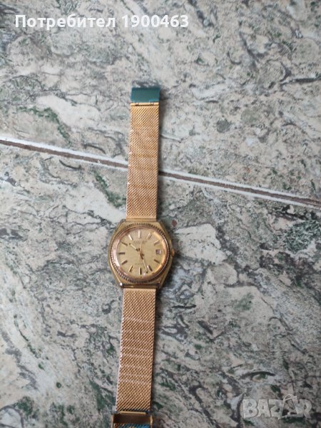 Рядък модел Японски механичен часовник автоматично навиване.Прпизведен през 70те години.Работещ .Позлатен,забележки по касата на места е леко протрита.Диаметър 37мм без коронката.Нова жълта стоманена верижка с ПВД покритие.