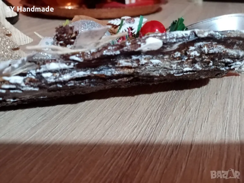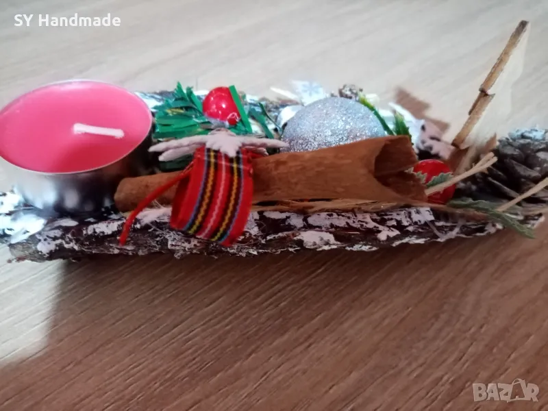 Ръчно изработен коледен свещник върху кора от дърво. Дължина 17см