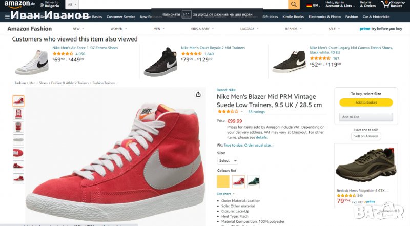 използвани. с минимални следи. По пътни и топли отвътре , идеални за този сезон Красиви , модерни , удобни Мъжките обувки Blazer Mid Prm Vntg Suede са една от силните страни на новата колекция на Nike . Здрави, практични и меки маратонки мъжки Blazer Mid Prm Vntg Suede могат да се носят при различни обстоятелства от ежедневието.Дизайнът ultrasportivo, ретро облекло, ежедневно облекло и ви позволява да носите Nike Blazer Mid Prm Vntg Suede с всяка визия.Ако търсите чифт мъжки спортни обувки , меки и гъвкави, тогава не можете да пропуснете Blazer Mid Prm Vntg Suede.Информационен лист- Велурена горна част за оптимално прилягане и максимален комфорт.- Гумена подметка за сцепление и дълготрайност.Светлоотразителни куки NIKE BLAZER MID PRM VINTAGE SUEDEДобавяйки безспорно нови функции към класическите мъжки обувки, мъжките обувки Nike Blazer Mid Premium 09 са идеални за всеки повод. Издръжливият дизайн е изработен от първокласни материали за внушителен външен вид.Велурена горна част и гумена подметка.EVA междинна подметка за леко омекотяване.