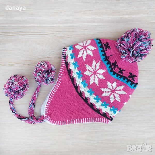 Дамска зима шапка с пискюли, машинно плетиво. Красив дизайн с фигури на снежинки. Мека и топка шапка за студените зимни дни. Вътрешната част е подсилена с допълнителен мек поларен плат за повече топлина.