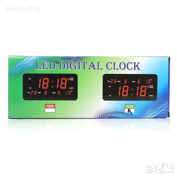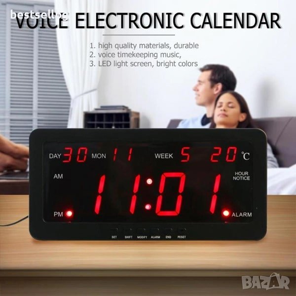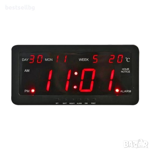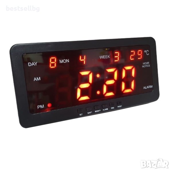 Настолен Стенен LED часовник с термометър, календар, аларма голям дисплей с червен цвят на цифрите и захранване на ток