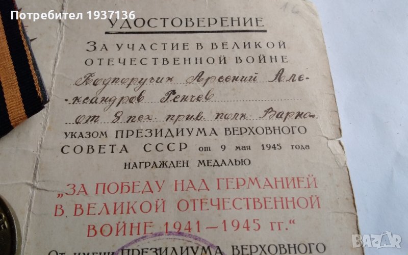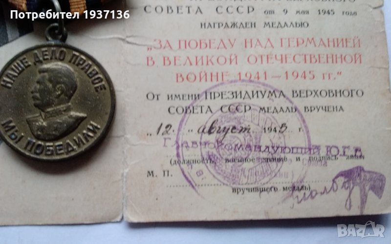 Медал за победата над Германия с оригинален документ.