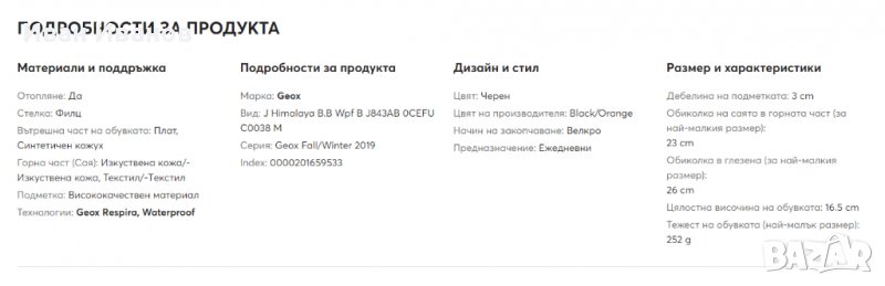 – Обувките са подобрени с технология Geox Respira, Waterproof. Подметката: висококачествен материал, притежава добро сцепление и предпазва от падане с грайфери