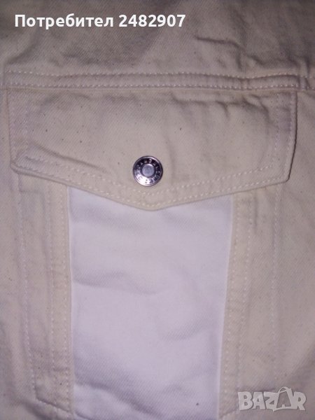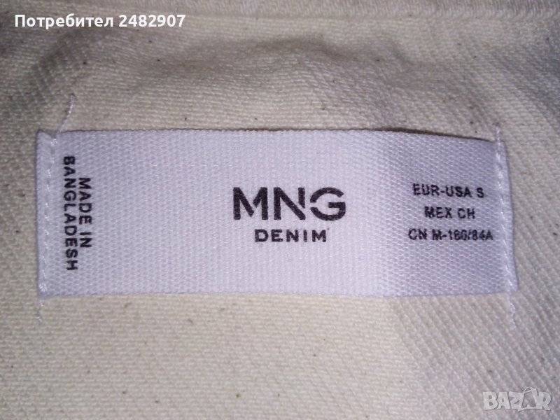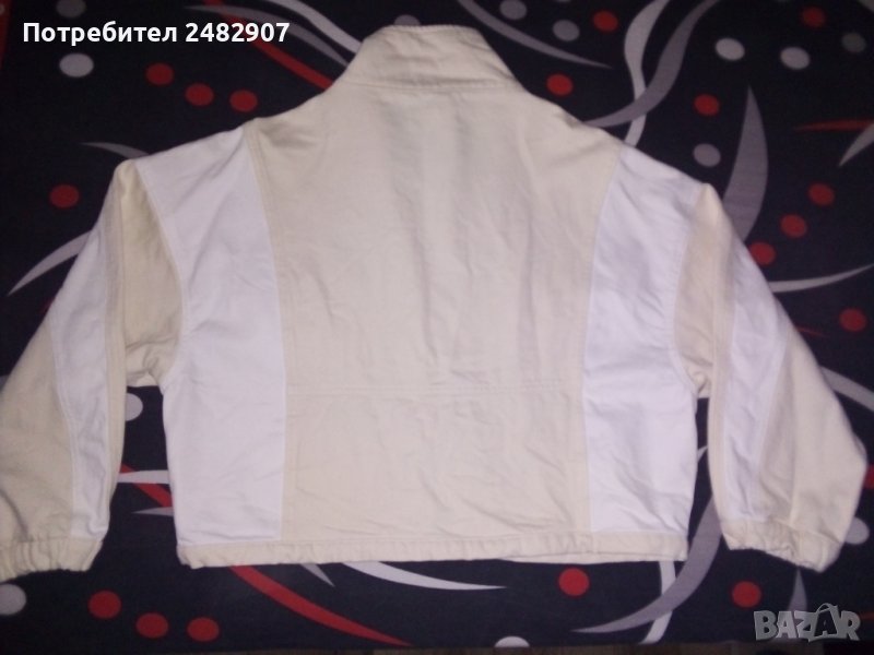 Дамско преходно яке "MANGO" в бяло и бежово, размер S, уголемено. Чисто ново, само е пробвано, с два джоба от пред и закопчаване с цип и скрити тик-так копчета. Ширина в раменете - 67 см, дължина от рамото до долу - 55 см, дължина на ръкава от рамото - 44 см, ширина в долната част - 53 см, с ластик в долната част на ръкавите.