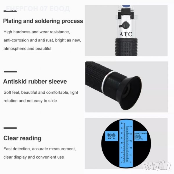 Професионален ИНСТРУМЕНТ рефрактометър за вино - измерване на захари /Brix/ и очакван алкохолен градус. Автоматична компенсация на температурата (ATC) от 10 ° C до 30 ° C.