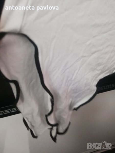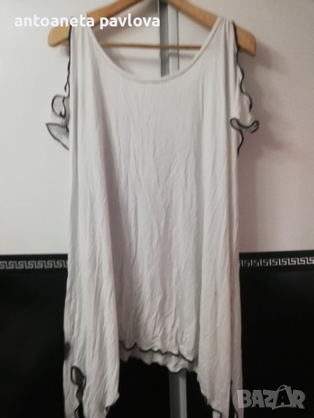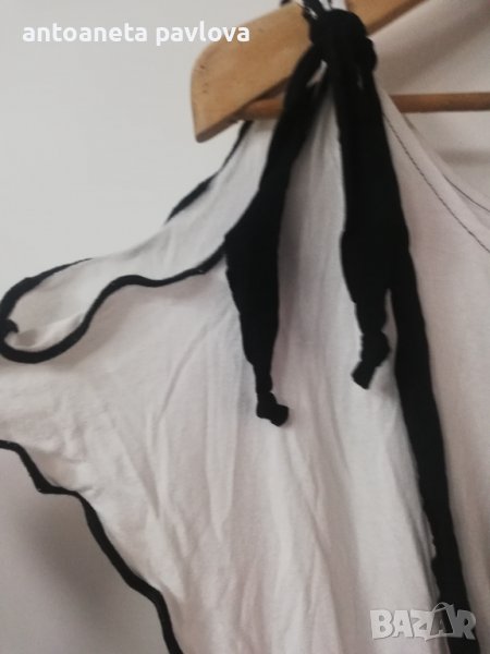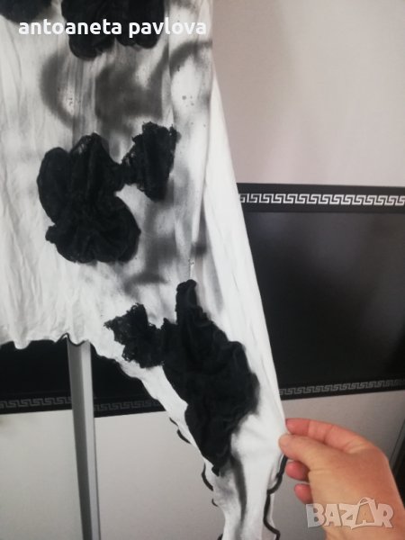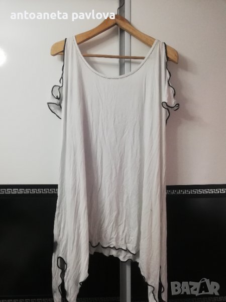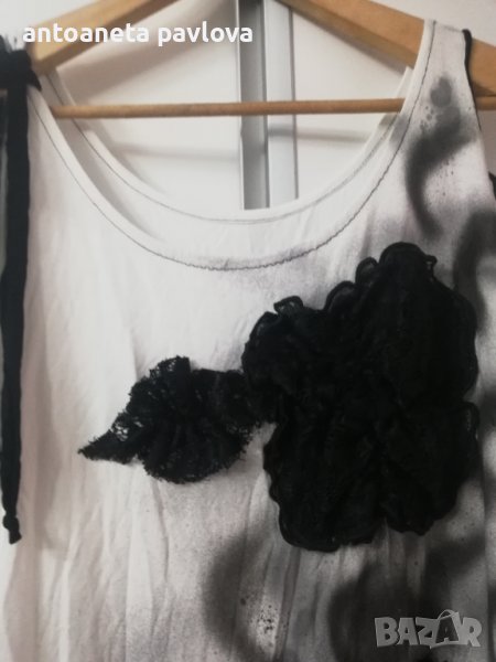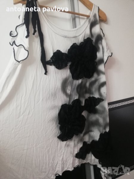 Туника от трико в бяло с голо рамо напръскана леко в черно Цялата е нашита с цветя ръчно изработени от черна дантела В страни е удължена с цепки