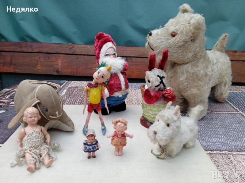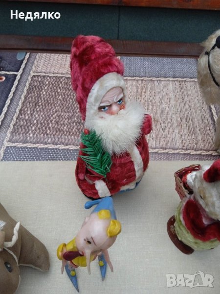 Цена за всички,играчките са автентични и са ръчна изработка,повече на телефона,само за сериозни ценители!За онагледяване,направих дисекция на слончето от последните снимки,което бе в лошо състояние.Естествени материали,папие маше и пластмаса,главата на Дядо Коледа е на конусна пружина и много интересно се движи при допир.Добавих още 2,цена за всички 11 броя плюс слончето.