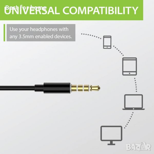 Широка съвместимост: 3,5 мм позлатен конектор е подходящ за аудио връзка и гарантира, че звукът се разпространява без изкривяване. Съвместим с повечето устройства с активиран 3,5 мм като: iPhone, устройства с Android, смартфони, MP3, MP4, Mac, лаптоп, таблет, настолен компютър, преносим музикален плейър.