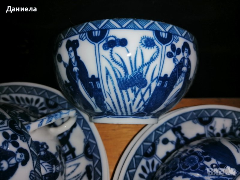Чаши 6 броя и чинийки 6 броя от фин порцелан тип "яйчена черупка", рисувани в синьо. Чашките прозират на светлина (има ги на 2 снимки).