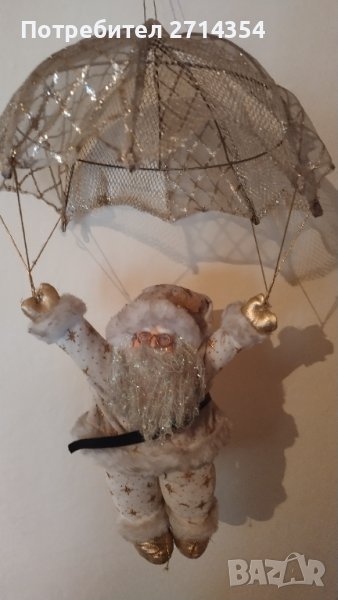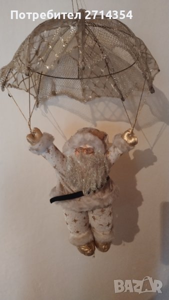 Красив дядо Коледа с парашут, размер на дядо Коледа 35 см а с парашута 60 см. Цвят златист брокат , главата на дядо коледа е от гипс една уникална декорация за предстоящите празници.За повече информация пишете или се обадете на посочения телефон.