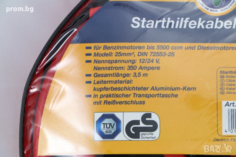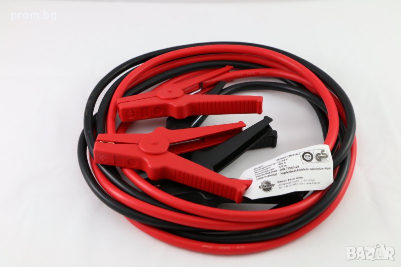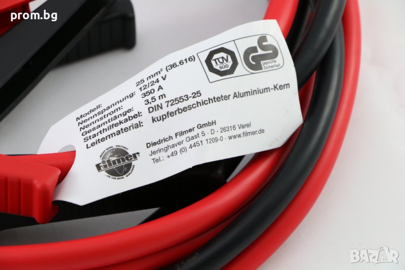Кабели за акумулатор, немски, FILMER. Внос от Германия. За бензинови двигатели до 5.5 л и дизелови двигатели с капацитет до 3 л. Произведени от висококачествена медно-алуминиева сплав, съгласно DIN 72553. Двата кабела имат напълно изолирани клемни крачета и дължина 3,5 м. Номинален ток 350 A. TÜV / GS-тест. Комплектът е от 2 кабела в червено и черно. Размери 350 х 350 х 70 мм. Напречно сечение на кабела 25 мм. Опаковани в транспортна чанта. Тегло: 1,6 кг