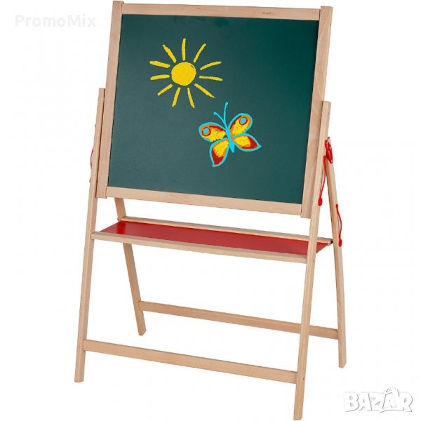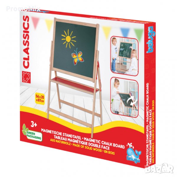 Beluga John A306518 е двустранна дъска за рисуване, изработена от висококачествен дървен материал, което я прави устойчива при използване. Дървената дъска е двустранна, като може да се пише и от двете страни. От едната страна е с класическа повърхност за тебешир в зелен цвят, а от другата е с магнитна бяла основа. Върху която могат да се закачат буквички и други интересни за детето аксесоари или да се пише и рисува.