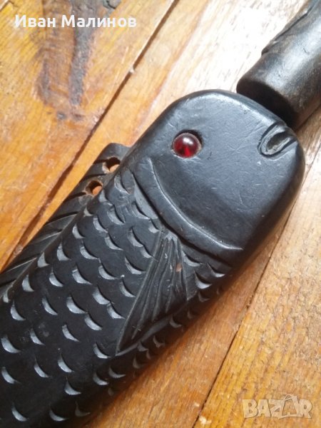 Рядък голям стар японски нож с дървена дръжка и кания с формата на риба .Обща дължина 42. Само ножа 36. Острие 24. Ширина в основата 4 см. Дебелина 5 мм.