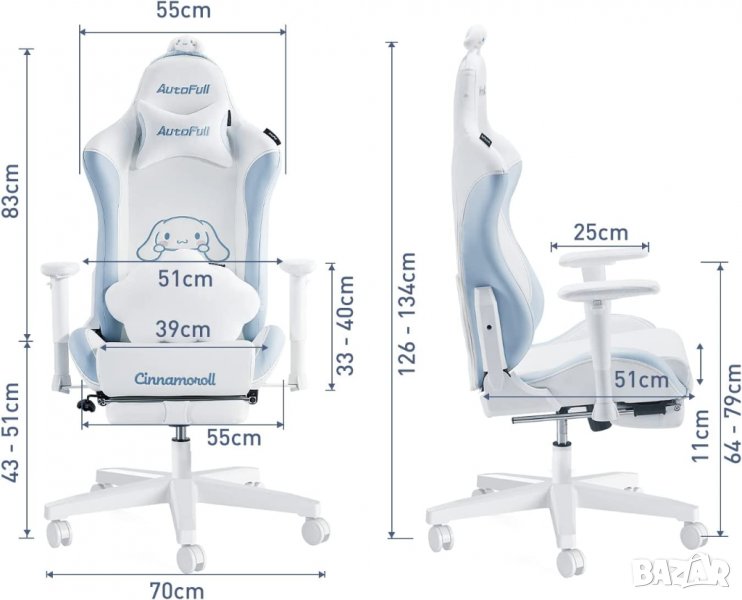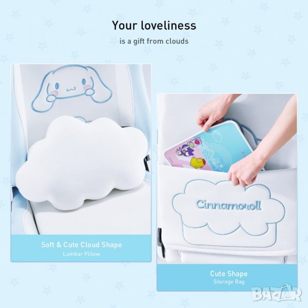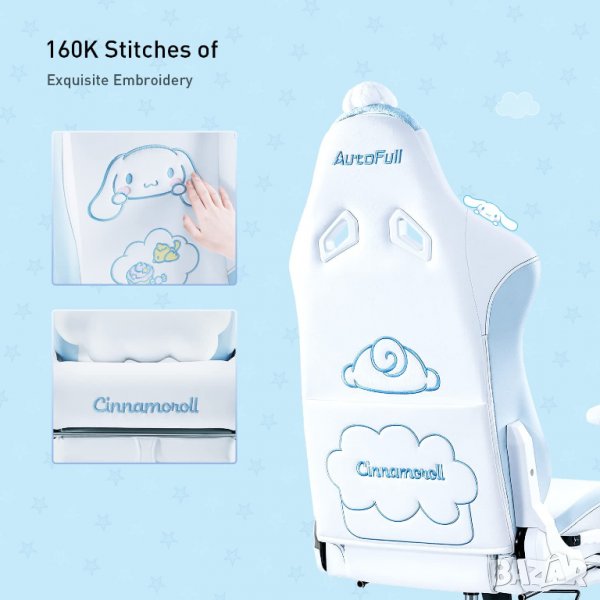 Геймърският стол Autofull Cinnamoroll поддържа здравословна седяща позиция, за да играете удобно с часове.