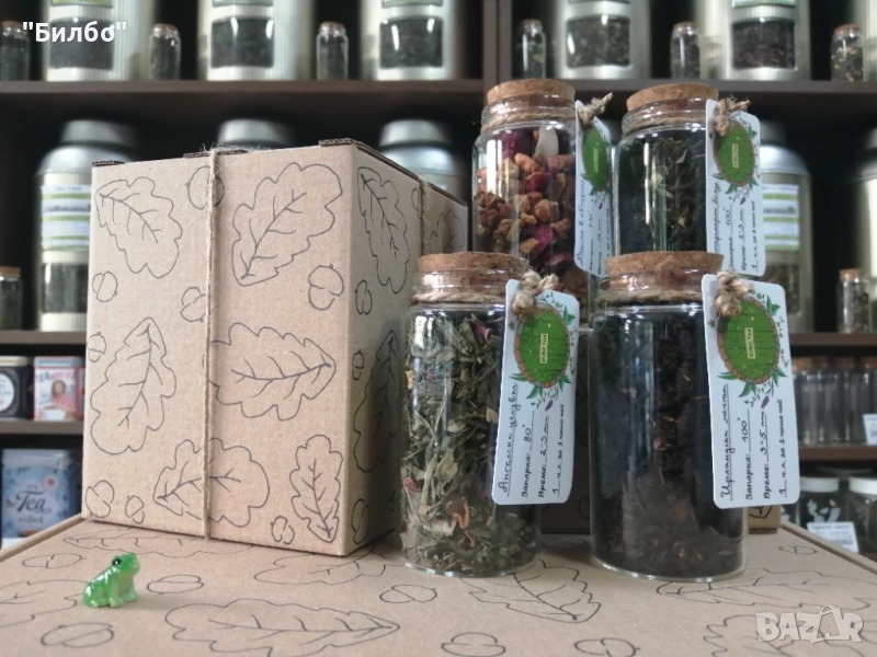 В "Билбо" може да ви приготвим симпатичен подарък, във формата на четири стъкленички с чай, в рисувана кутийка - уплътнени със сено.