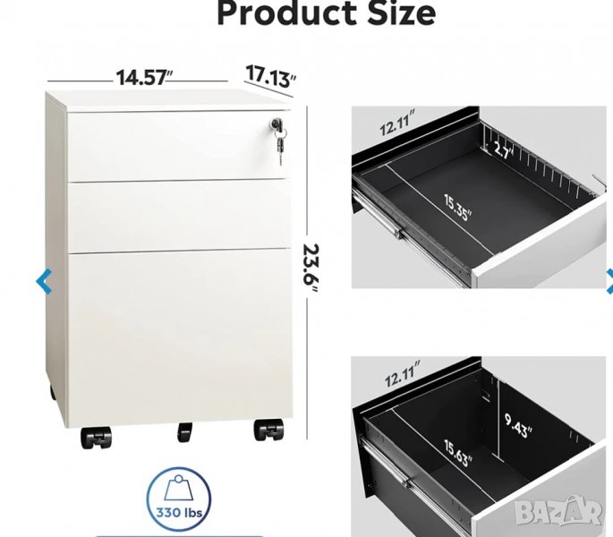 Напълно сглобеният метален шкаф се побира под повечето бюра.