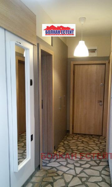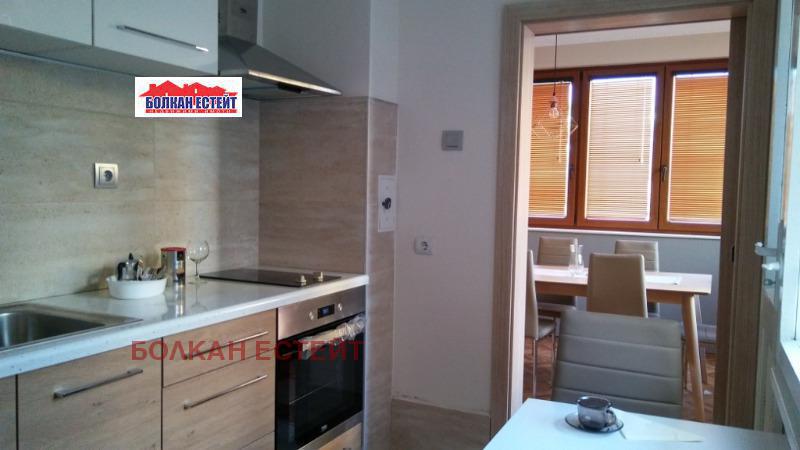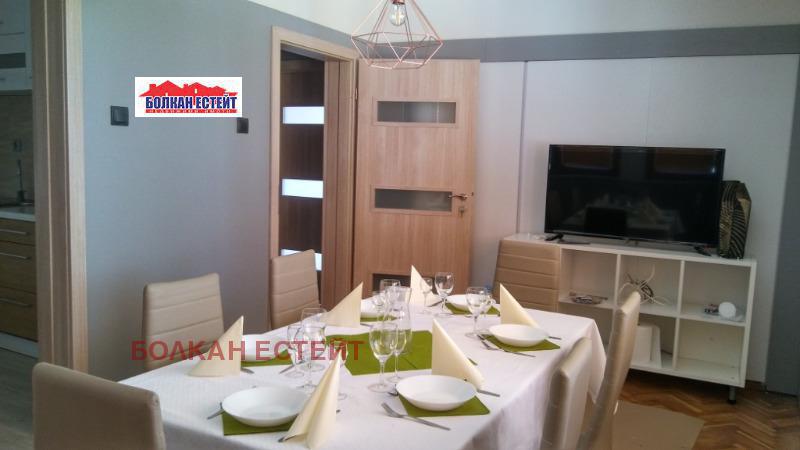 Агенция за имоти Болкан Естейт Ви предлага четиристаен апартамент под наем в идеалния център на град Велико Търново в близост до заведения, хранителни магазини, банки, парк. Имотът е с югоизточно изложение и разполага с площ от 105 кв.м. разпределени между входно антре с вграден гардероб, просторна всекидневна от която се излиза на тераса, самостоятелна трапезария и кухня, две спални, килер, баня и тоалетна отделно. Жилището се намира на междинен етаж и се предлага изцяло обзаведено и оборудвано с всички необходими мебели и електроуреди-вградени фурна и котлони, ширм, умивалник, отделен кът за пералня, баня и тоалетна отделно с луксозни вградени бидетни тоалетни чинии, огледало с осветление и отопление . За ефективно отопление и охлаждане са поставени инверторни климатици и инверторна мултисплит система за спалните. Вътрешен двор. Тиха улица. Гледка към хълм 'Света гора'.