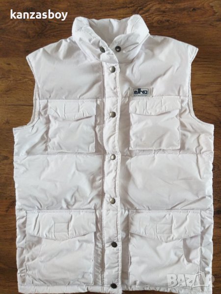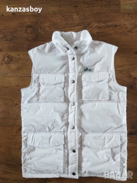 ретро мъжка жилетка Elho от 90-те е изработена от издръжлив материал от смес от полиестер и памук и е изолирана с патешки пух. Разполага с множество джобове