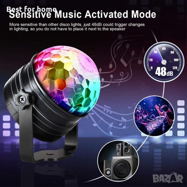 За разлика от други диско лампи със 70 dB, само 48 dB могат да предизвикат промени в осветлението и скоростта, диско светлината ще танцува на музика, дори детски смях, пляскане или пеене