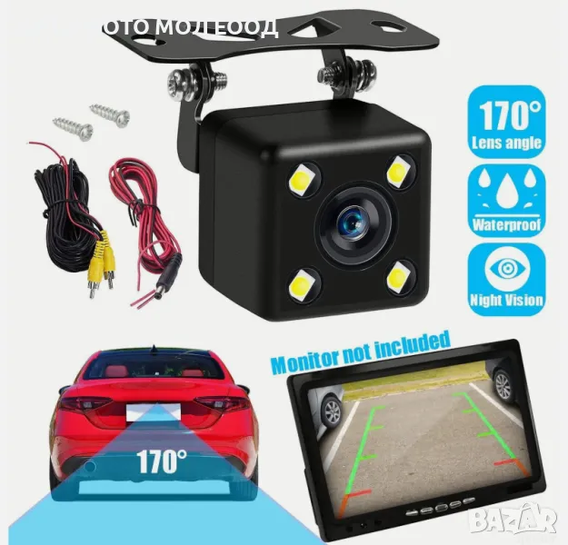 Камерата се пуска автоматично на дисплея когато включите на задна скорост, за най-добра видимост камерата се монтира близо до багажника или до стойката за номера.