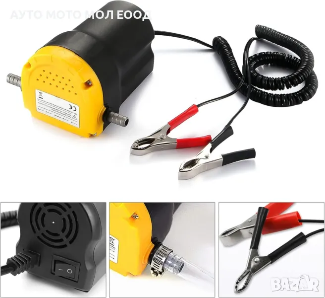 Електрическа помпа за източване на двигателно масло, трансмисионно масло и дизелово гориво. Тя ще ви спести много време и усилия при смяна на маслото. Помпата е с мощност 60 W и работно напрежение 12 V, което ще направи трансфера на течностите по- бързо и без проблемно. Особено ефикасна е при смяна на маслото на скоростната кутия и диференциала на автомобила, тъй като не винаги пробката за източване е на лесно място и отнема повече време, а с използването на електрическата помпа ще спестите време и усилия. Тя се свързва с помощта на щипки, които се закрепят към положителния и отрицателния полюс на акумулатора на превозното средство.