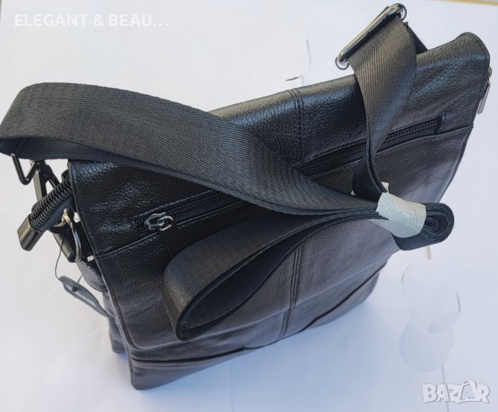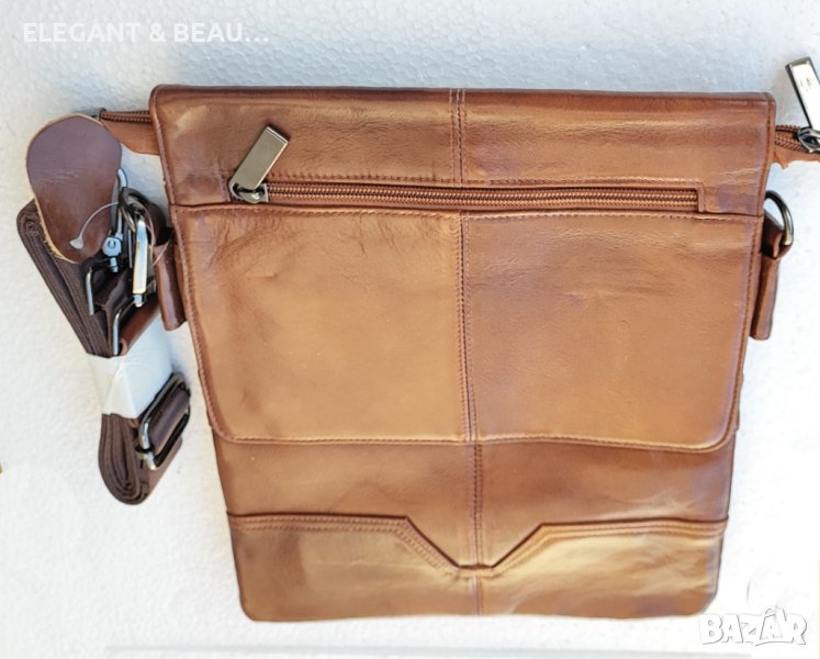 Мъжка чанта от естествена телешка кожа, с ремък за през рамо, сдве големи отделения, едното с вътрешен джоб с цип, с преден джоб с общ капак на магнит и един заден с цип.