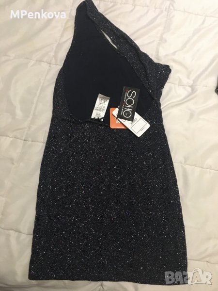 Рокля тъмно син брукат, еластична. С гол гръб, с едно рамо. Kiki Riki е марката. Размер М, но на момиче с разнер S също би и станала.