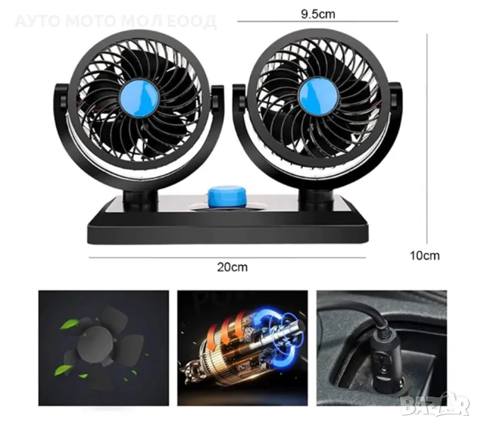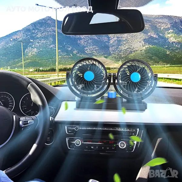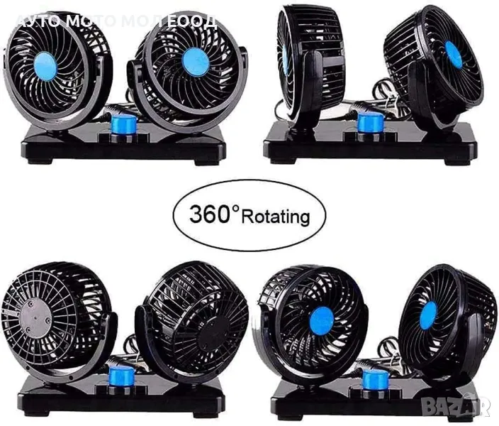 Двоен вентилатор с две скорости за кола, 360 градуса - 12V/24V