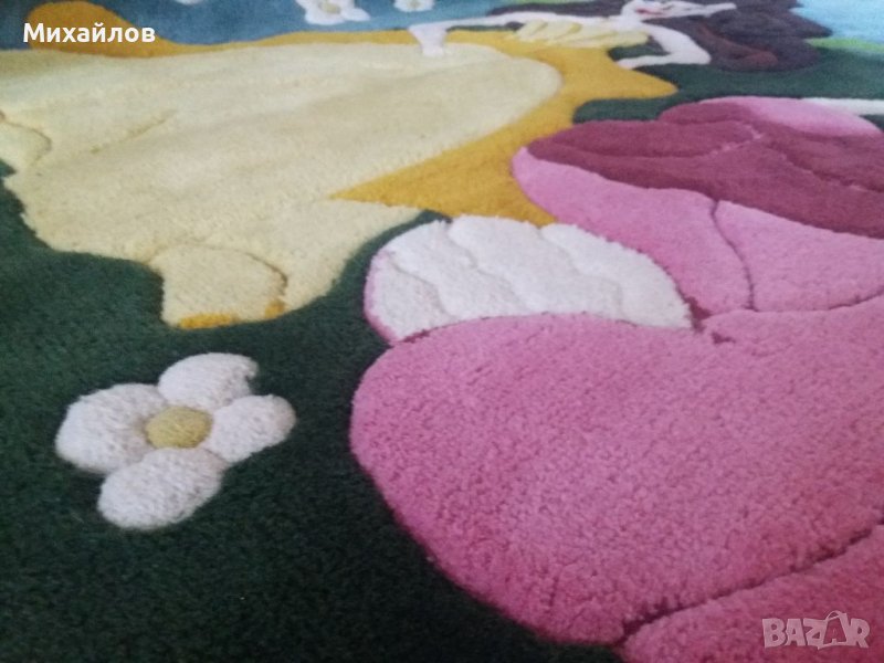 Нов дебел релефен вълнен килим. Размери 235/165 /2 см. Правен по поръчка с мотив Принцесите от Desney приказките. Не се е ползвал заради алергия към вълната.