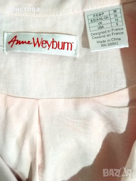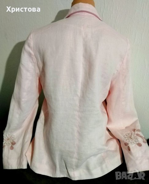 Бледо розово сако от памучна материя, наподобяваща лен, с подплата, седефени копчета, два джоба с капаци, окрайчен в тъмно розово ревер и бродерии на цветя в тъмно розово в долния край на ръкавите.