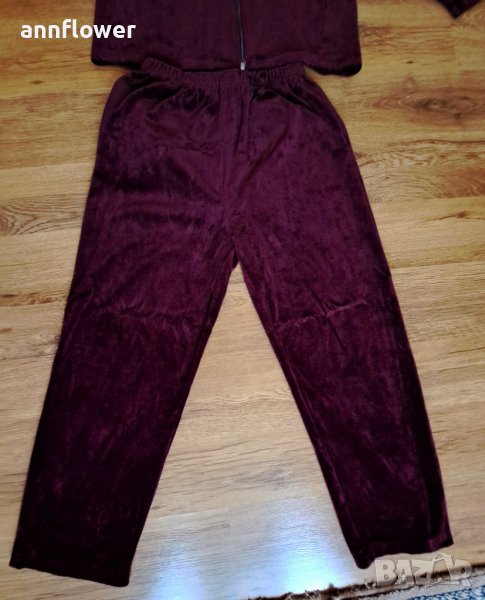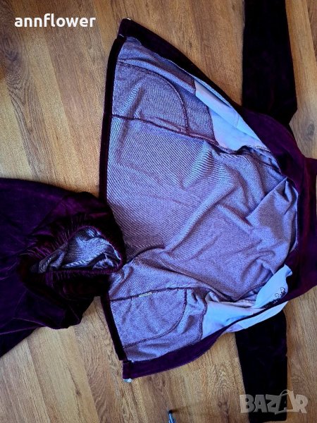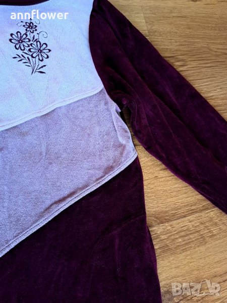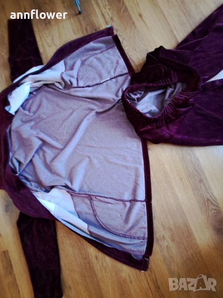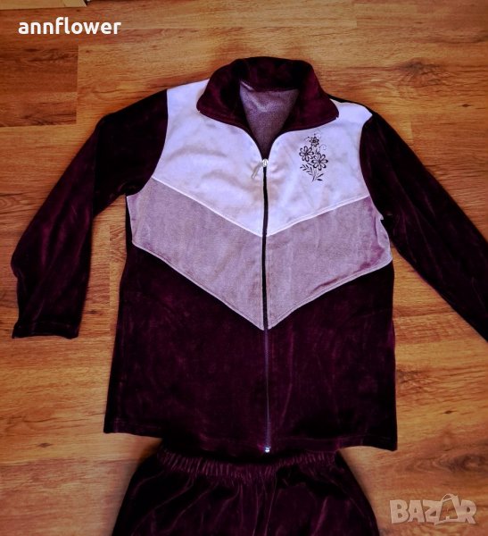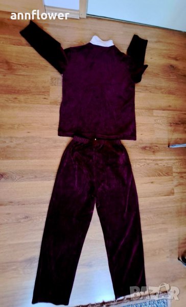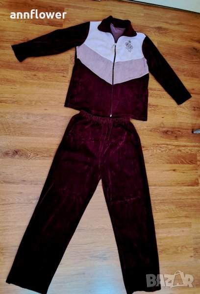 Комплекта е като нов без забележки. Цвят бордо с розово и бяло. Размер S/M. Горнище: дължина 63см, ширина на рамената 41см, ширина в мишниците 50см. Дължина на ръкава 53см.