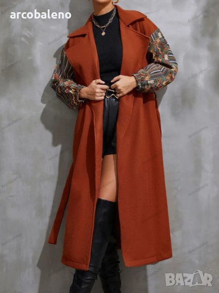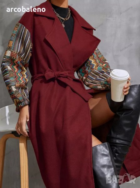 Дамско палто с дълга яка, пачуърк ръкави и връзка на талията отпред, 2цвята