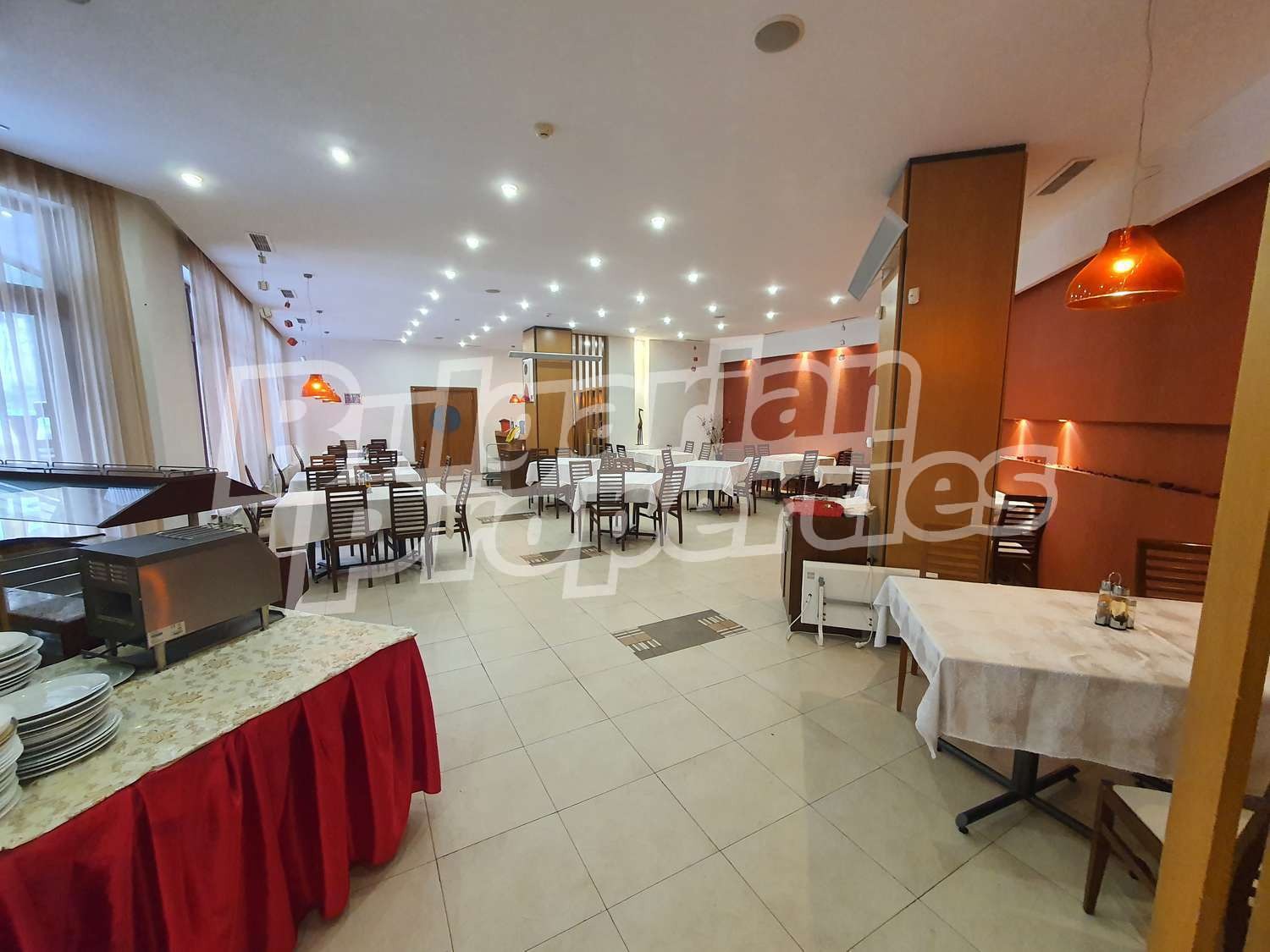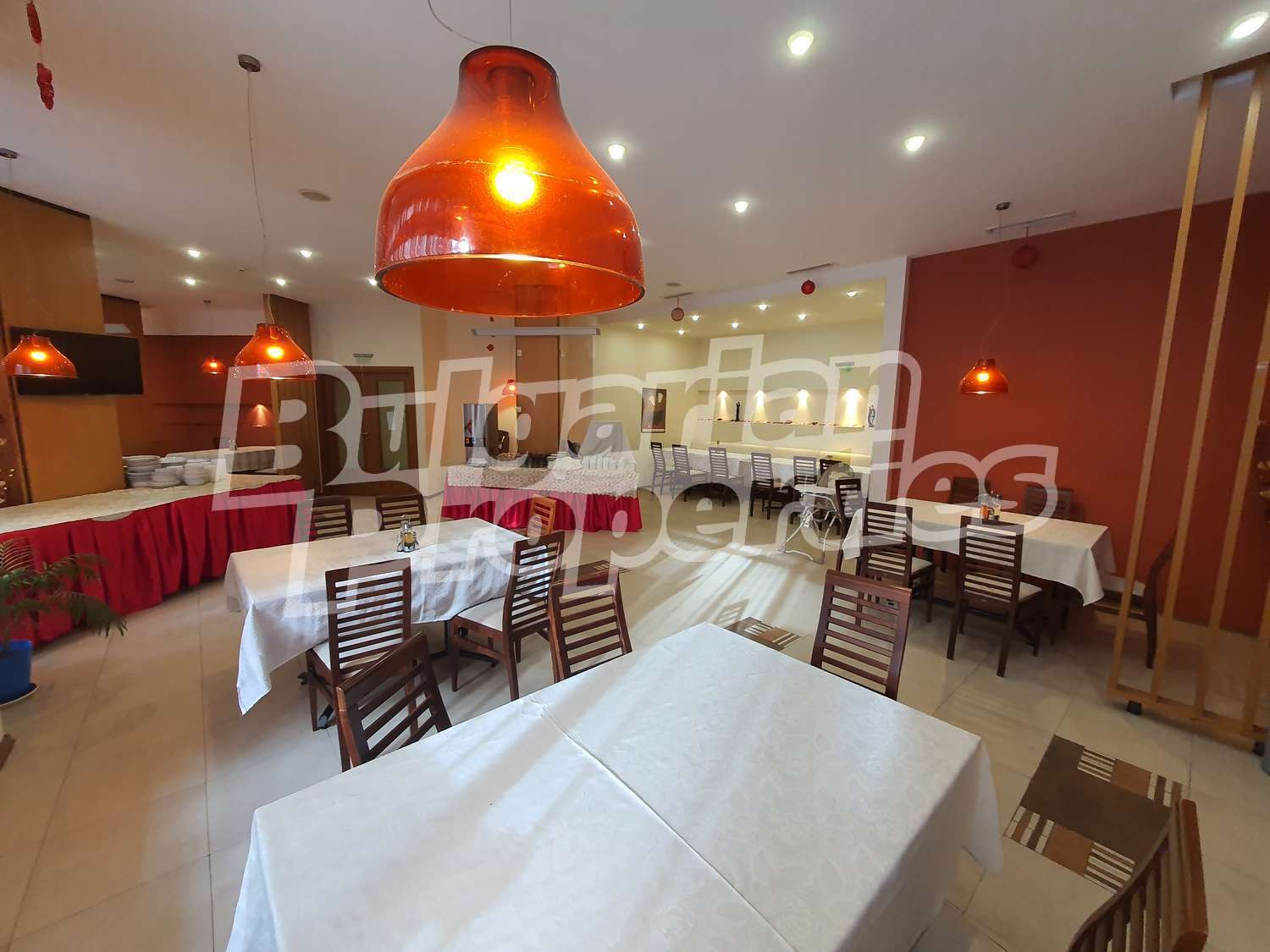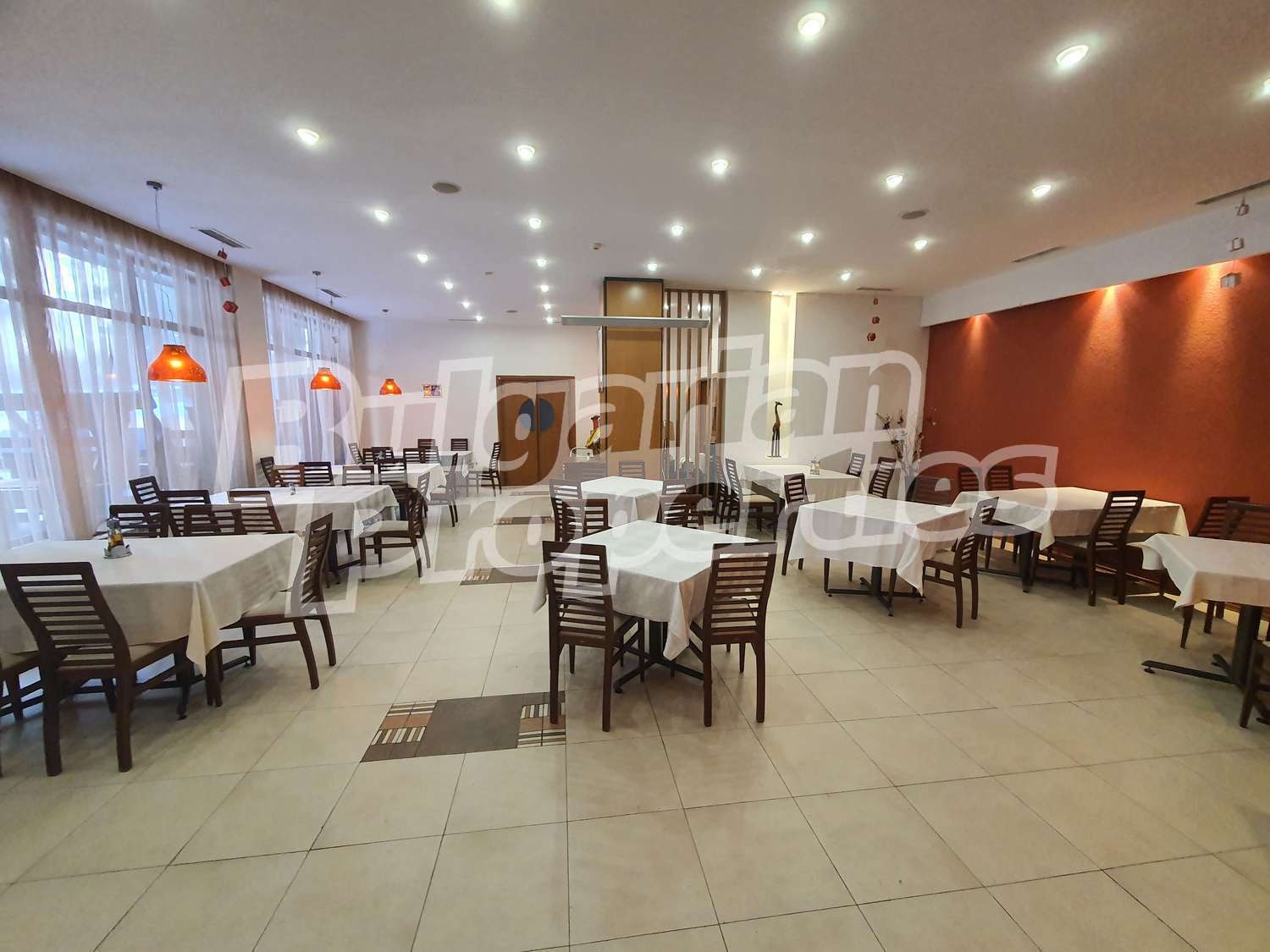 Ресторантът е напълно обзаведен и готов да посрещне нуждите на Вашия бизнес. Намира се на партерно ниво, заеманата площ възлиза на 591.63 кв.м. (479.40 кв. м. + 112.23 кв.м.), изложение: изток, разпределение: