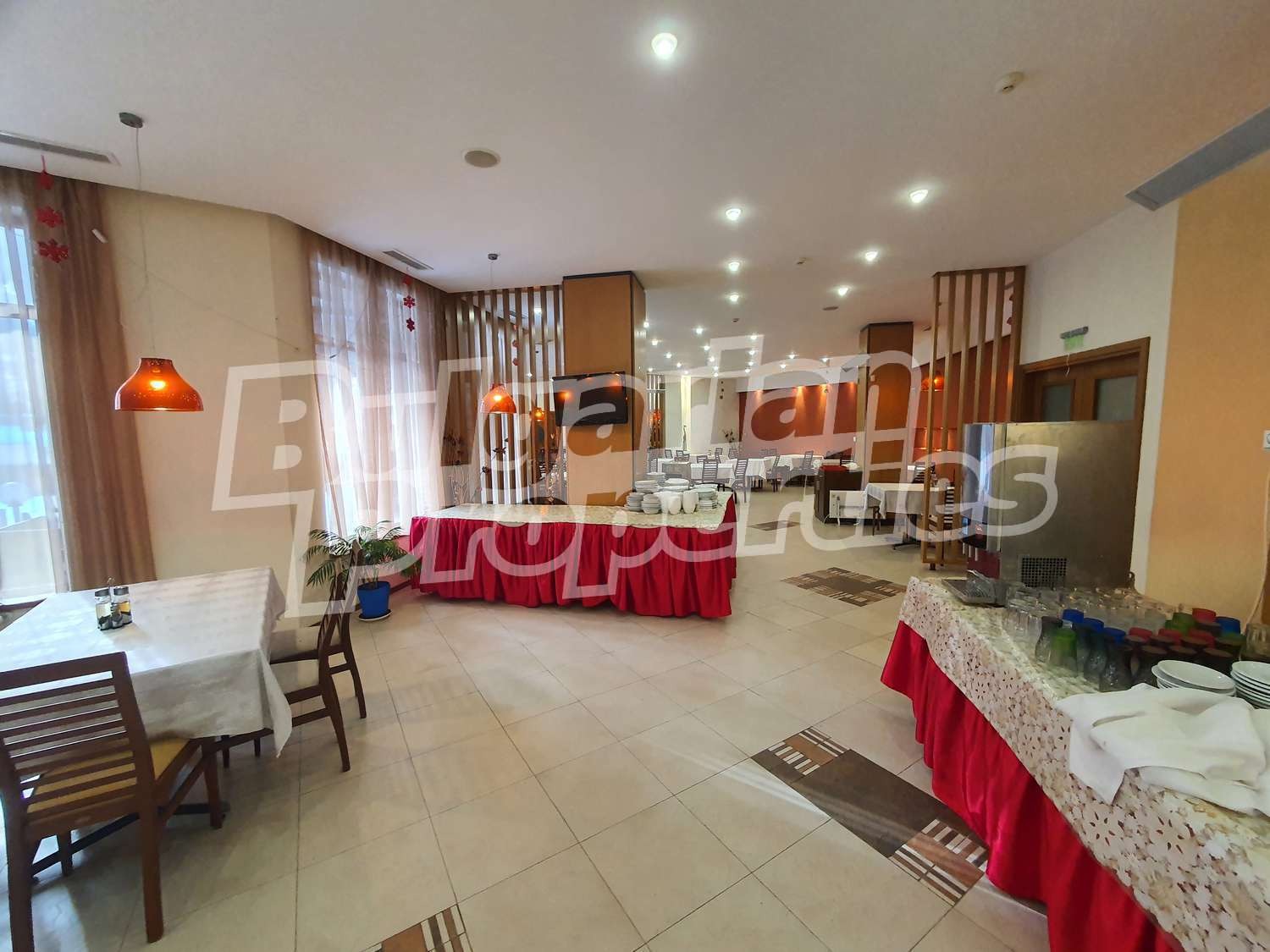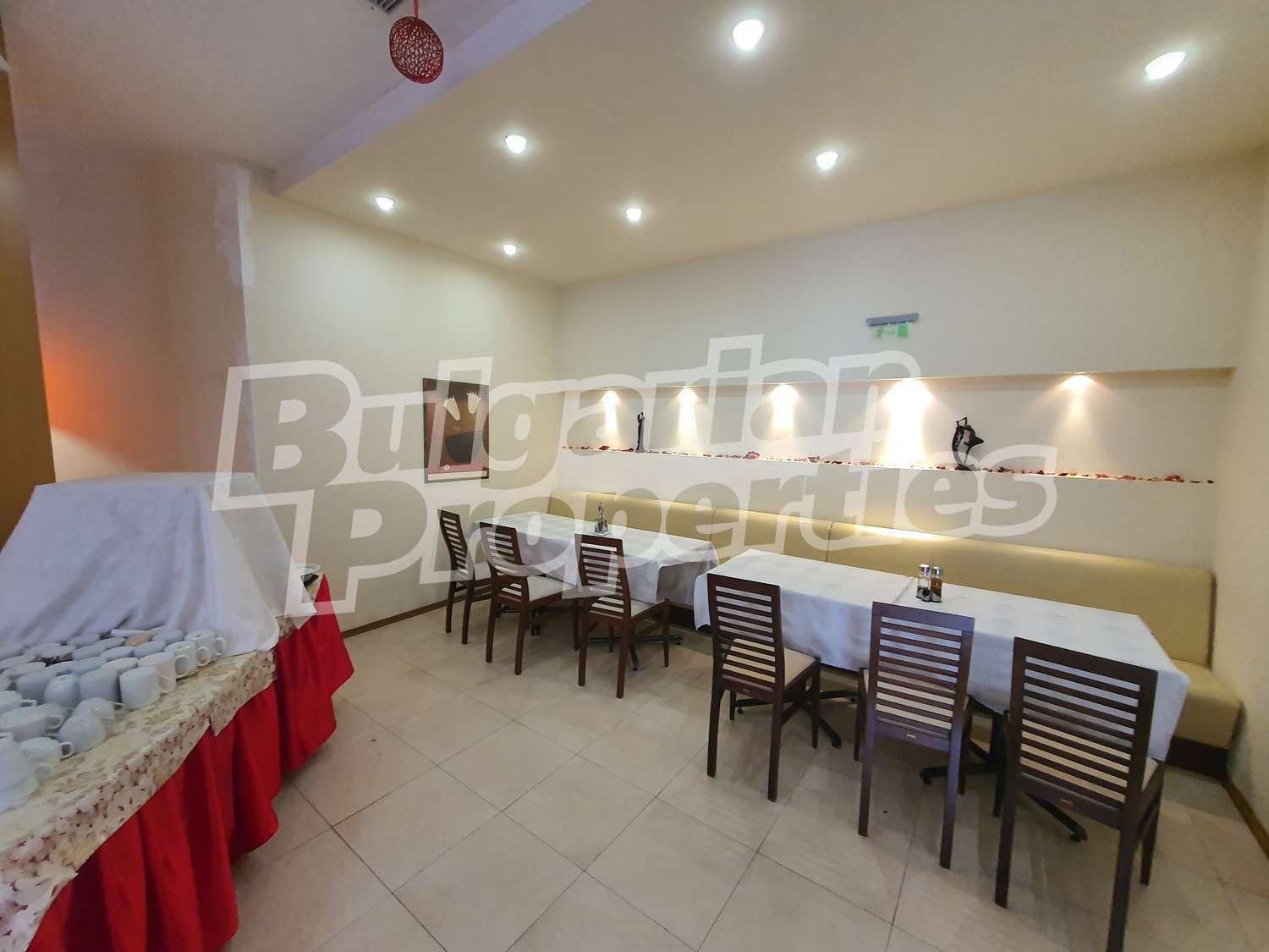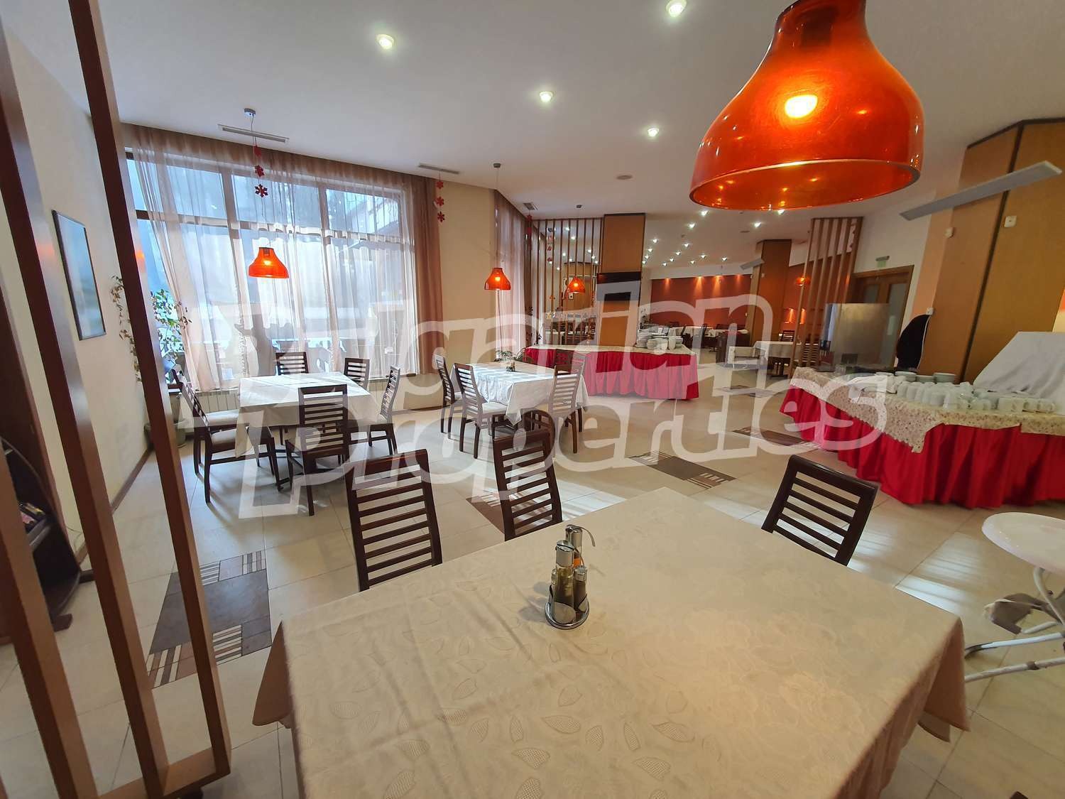 Ресторантът е напълно обзаведен и готов да посрещне нуждите на Вашия бизнес. Намира се на партерно ниво, заеманата площ възлиза на 591.63 кв.м. (479.40 кв. м. + 112.23 кв.м.), изложение: изток, разпределение: