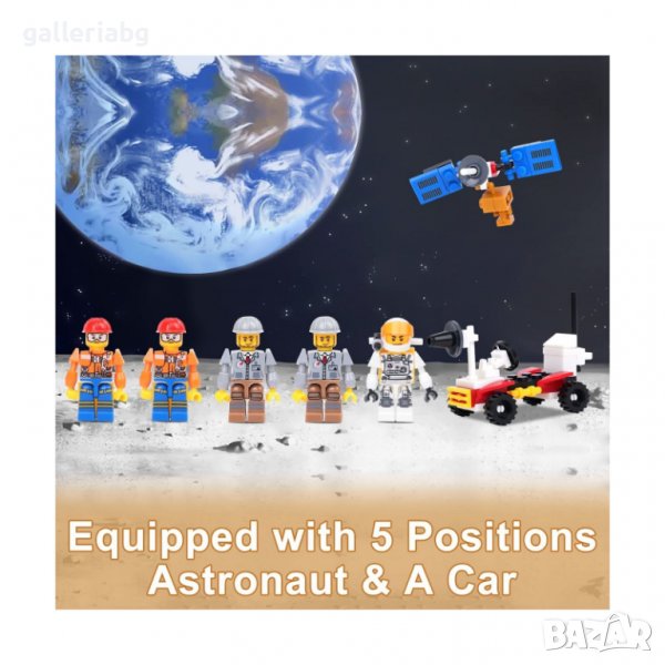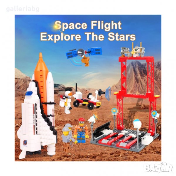 Голям комплект конструктор с космическа ракета, стартова площадка, луноход, сателити и цели 5 астронавти. Частите са съвместими с Lego. Подходящ за деца над 6 г. – идеален за игра и подарък!