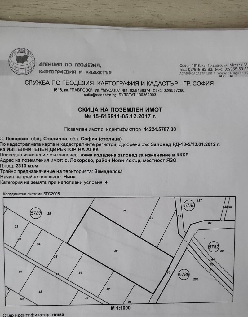 с.Локорско, Район 'Нови искър', община 'Сталична': на 200 м от пътя от гр. София. Парцел от 2310 дка в местността 'ЯЗО'. Статут: нива. Категория на земята: IV-та. Екологичен район. С възможност за земеделско производство или за смяна на статута.
