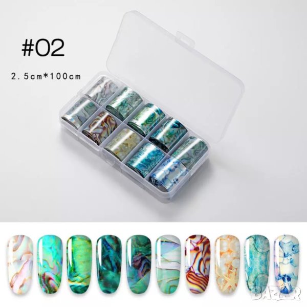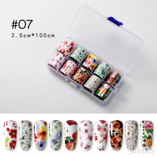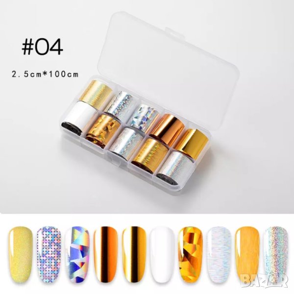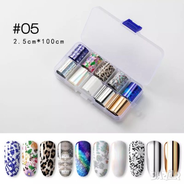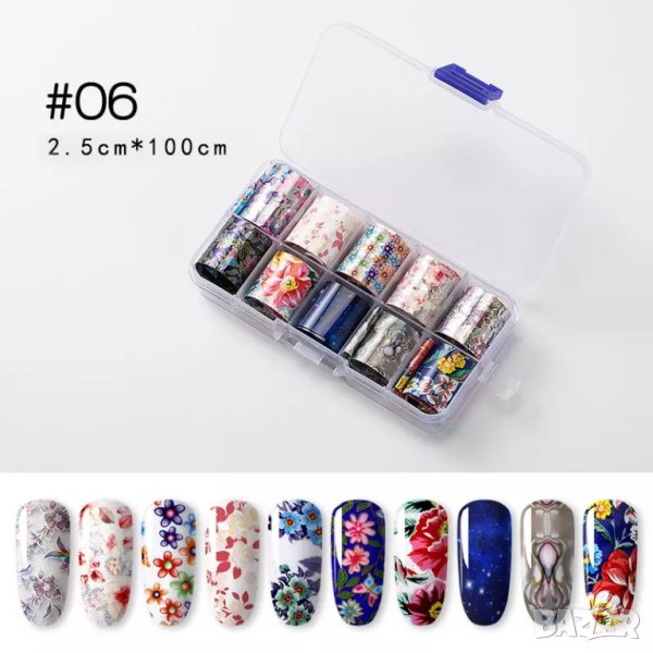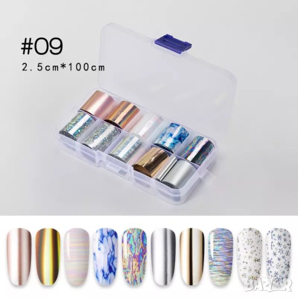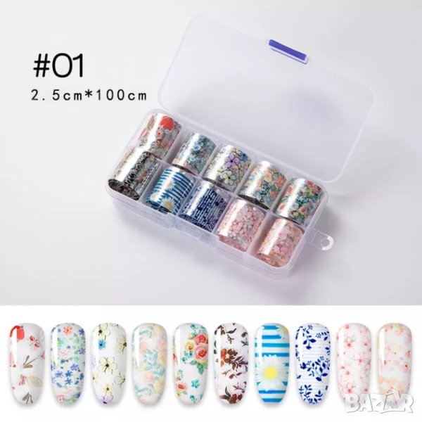 10 ролки / Комплекти фолио за маникюр в кутия - Цената е за една кутия с 10 ролки . Комплектите са като на снимките , не е възможно комбиниране на модели от няколко комплекта .