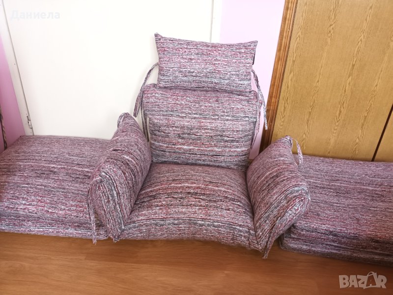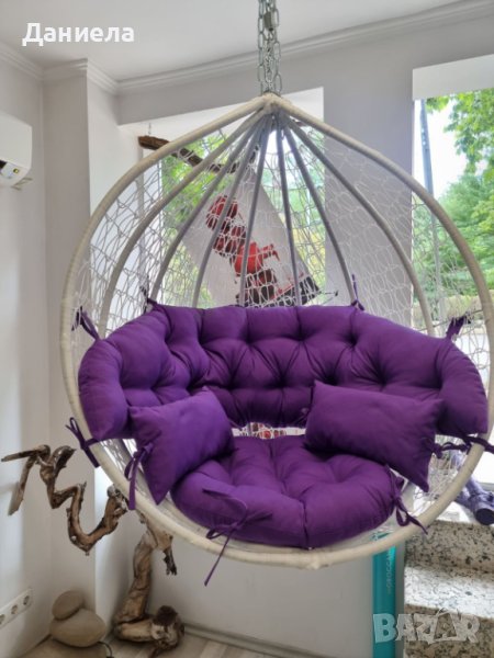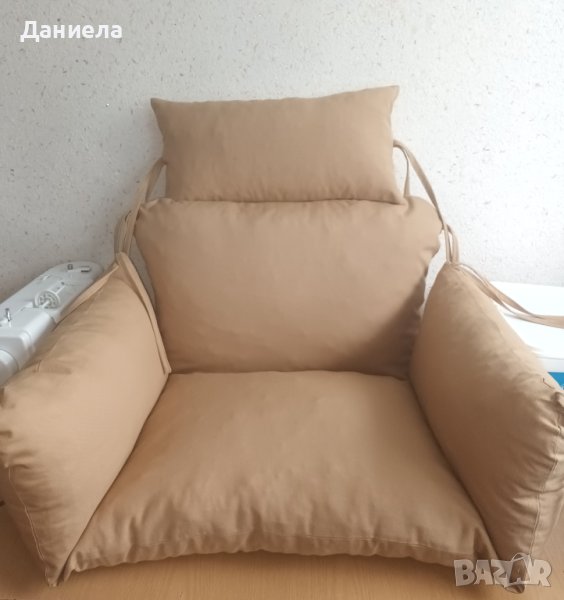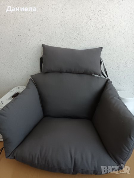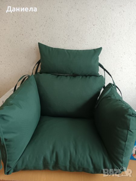 Възглавница за висяща люлка тип яйце. Плат, незадържащ петна и вода и пълнеж от млян дунапрен. Калъфът е с цип, Пълнежът е във вътрешни възглавнички, които се вадят за по-лесно пране.