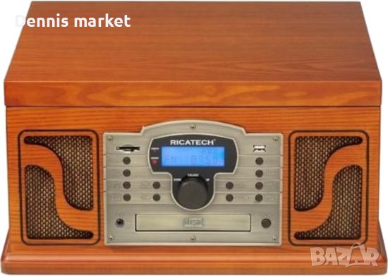 Ricatech RMC250 6-в-1 музикален център. 3-скоростен плейър за 33, 45 и 78 об / мин, CD плейър, касетофон, цифрово AM / FM радио, USB порт, слот за SD карти. Дървен корпус с капак. Довърши: дърво от паприка.