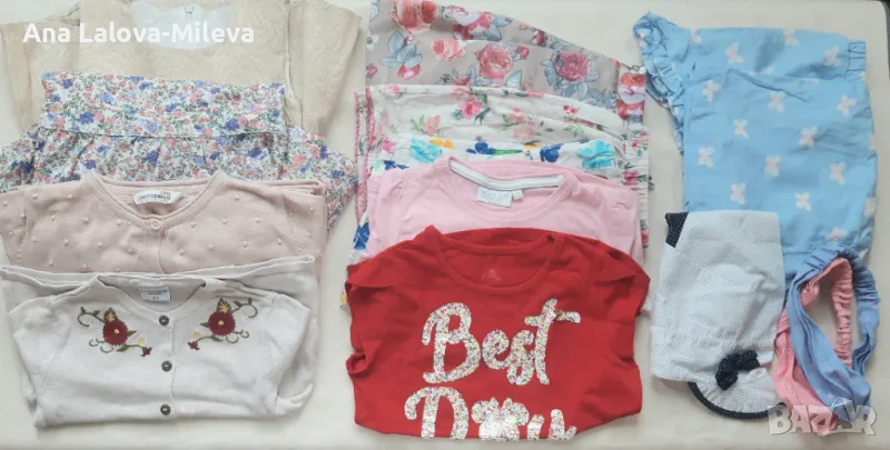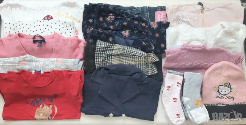 ЛОТ 1 включва: ватиран клин и ватиран суичър Н&М, жилетка от памучно трико, суичър, пухкаво болеро, дънки (само изпрани), блуза Mayoral, дебела пола, комплект пола и елек (нови, само изпрани), пончо (ново, само изпрано), 4 чифта хавлиени чорапи, 2 чифта памучни чорапи, шапка Hello Kitty, 2 ленти за коса (едната нова). Цена 23 Евро. При интерес мога да го разделя.