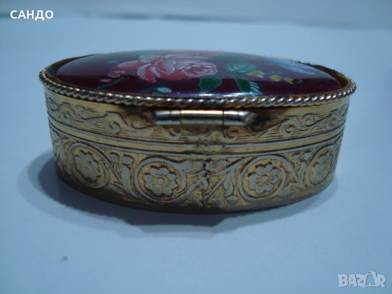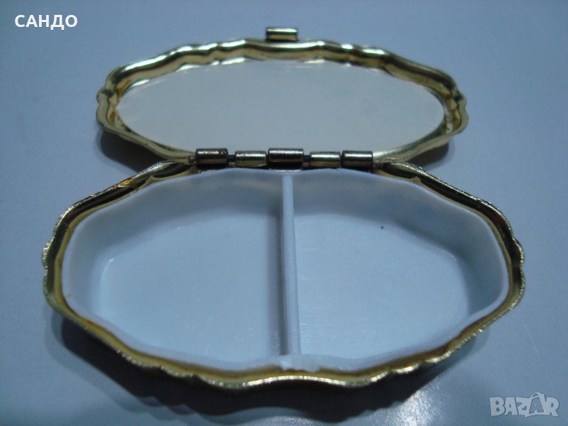 Първата кутиика луксозна изработка,метална ,позлатена за подсладители,лекарства и др. Размери : дължина 6 см,ширина 3 см ,виснночина 1,5.см . Капака порцеланов растителен орнамент. Много красива и функционална. ЦЕНА 12 лв Втората кутиика луксозна релефни орнаменти ,метална, позлатена. Капака е с порцеланова рисунка от цветя -рози. Предназначена за лекарства,подсладители и др. Размери : дължина 5 см, ширина 3,3 см , височина 1,7 см Много прекрасна изработка и функционална. ЦЕНА 15 лв.