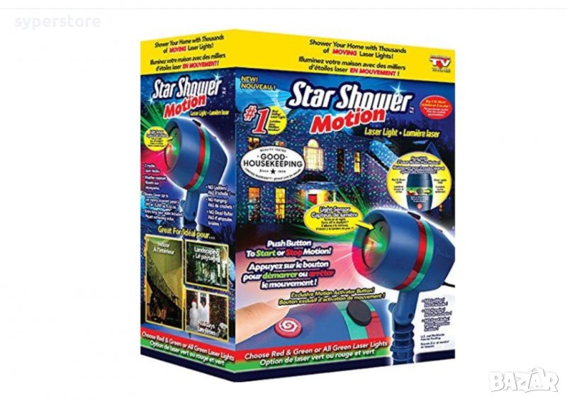Лазерен проектор Star Shower предлага атрактивни светлинни ефекти - комбинация между зелени и червени точици и фигури, милиарди светлинки, които ще огреят фасадата на дома ви или пък вашия хол. Да, този лазер е подходящ за употреба на открито и закрито. Ползва се изключително лесно. Може да го контролирате механично или да включите опцията за работа със сензора за светлина. Така, когато стане тъмно, проекторът се включва, а когато е светло - изключва. Спестявате енергия и нямате ангажимент да се занимавате с него.