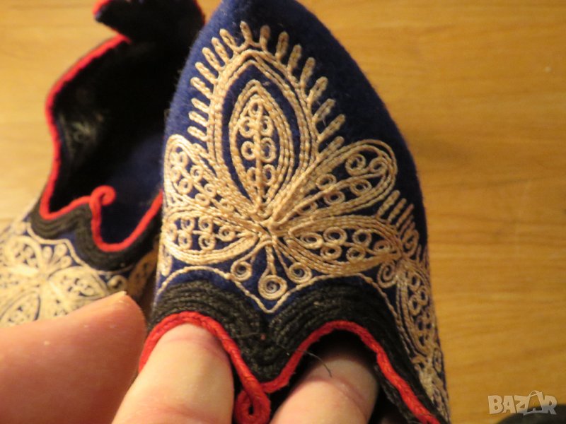Старинни родопски невестински везани терлици с гайтан изработка 50те години - сини с червен кант - съхранете българския бит, красота и култура.
