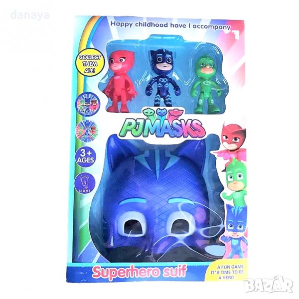 Комплектът се състои от светеща маска с включени батерии (АG13) и 3 броя фигурки Пи Джи.
