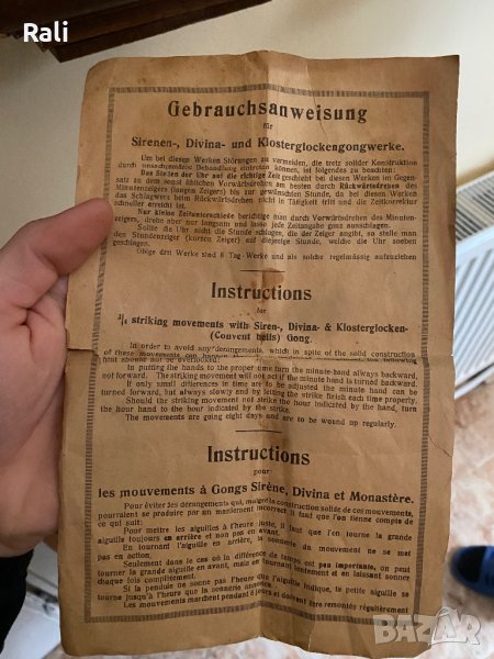 В отлично състоняие. Работи. Механизъм като на часовник четири четвърти, но с две пружини. Бие на 15,30,45,кръгъл час съответно веднъж, два, три, четири пъти и на часа с друг гонг отброява колко е часа. При интерес е възможно да изпратя клип.