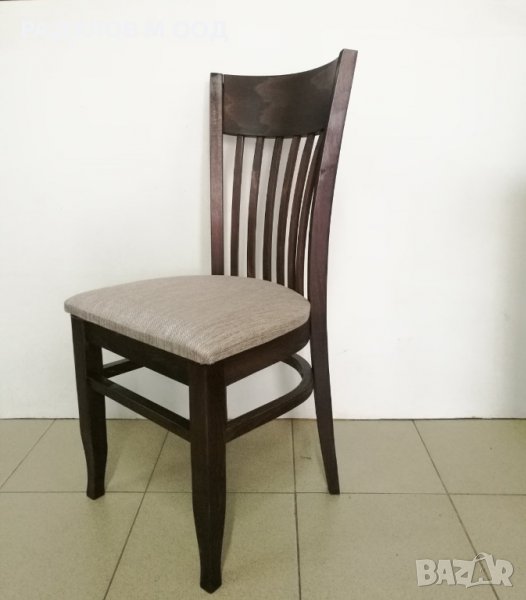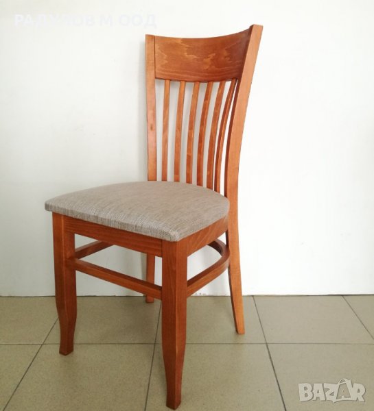 Стол със здрава конструкция от естествена букова дървесина за устойчивост и стабилност, Седалката е проектирана с твърда основа, тапицирана с дунапрен за повече комфорт при седене и завършен със здрава текстилна дамаска, лесна за поддръжка.